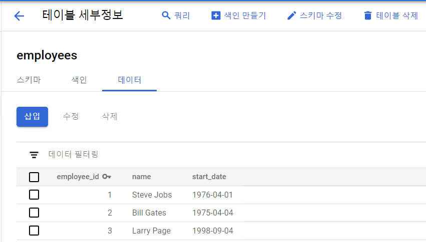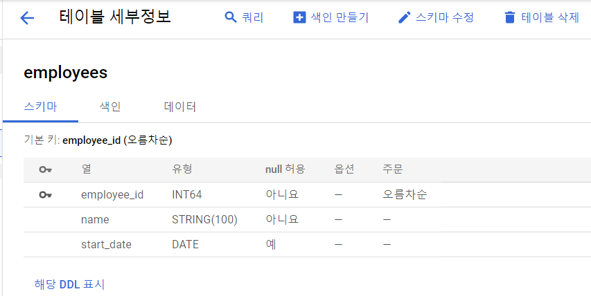 위의 employees 테이블이 생성되면 스키마, 색인, 데이터 등 테이블 세부 정보를 확인할 수 있습니다.