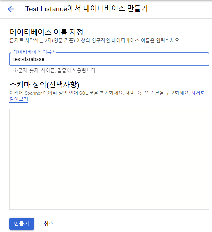 위의 설정을 마치고 Spanner 인스턴스가 생성되면 새 데이터베이스를 생성하도록 하겠습니다.