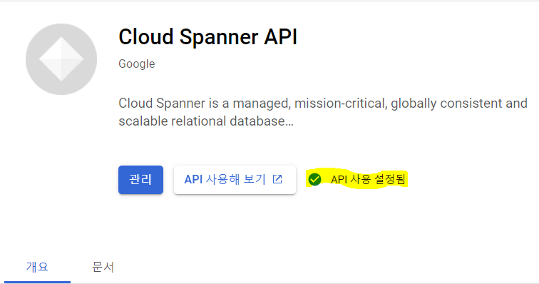 검색창에 Cloud Spanner API 를 검색한 후, 'API 사용 설정됨' 으로 나타나도록 설정합니다.