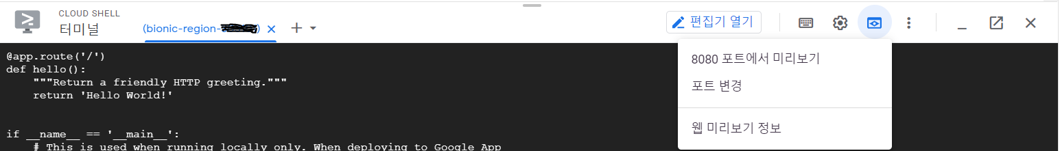 App Engine > 대시보드 > 만들기 > 언어:Python > Cloud Shell 선택 > Shell에 코드 작성 > 웹 미리보기 ( 8080포트에서 미리보기 ) > 'Hello World!' 가 출력됨