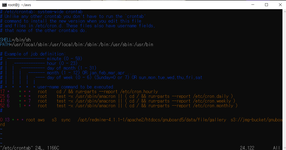 0 13 * * * root aws s3 sync /opt/redmine-4.1.1-1/apache2/htdocs/gnuboard5/data/file/gallery s3://jmg-bucket/gnuboard // 매일 13시에 gnuboard의 gallery에서 S3 버킷의 gnuboard 디렉토리로 업로드