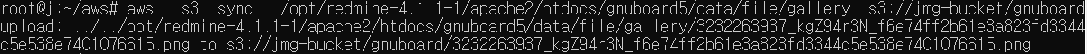 #aws s3 sync /opt/redmine-4.1.1-1/apache2/htdocs/gnuboard5/data/file/gallery s3://jmg-bucket/gnuboard
