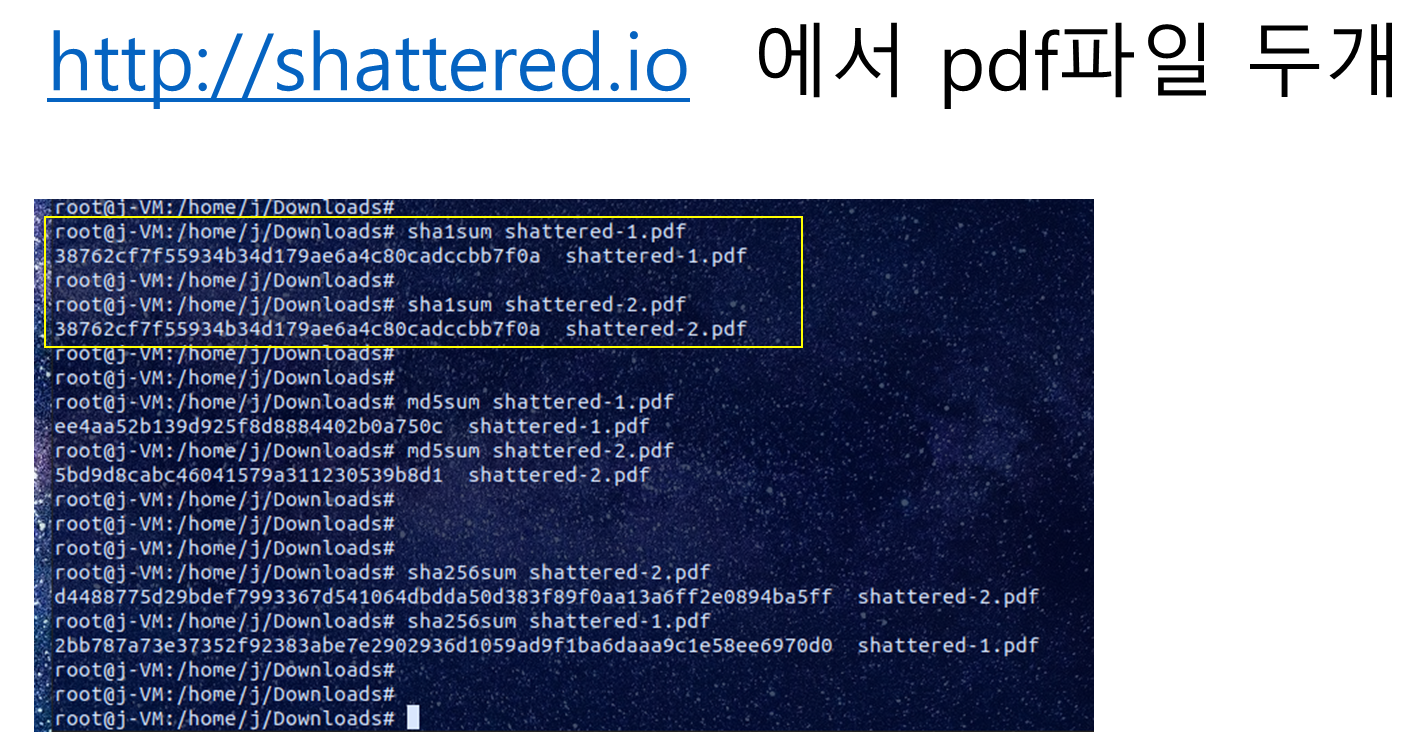http://shattered.io 에서 pdf 파일 두개를 다운로드 한 후 해쉬값 비교